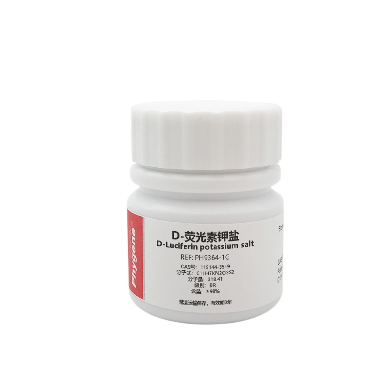 D-Luciferin potassium salt中文名为D-萤光素钾盐,全称是4,5-dihydro-2-(6-hydroxy-2-benzothiazolyl)-4S-thiazolecarboxylic acid, monopotassium salt。D-Luciferin是萤火虫萤光素酶(firefly luciferase)最常用的底物,在ATP、镁离子和氧气存在的条件下通过萤火虫萤光素酶的作用进行氧化脱羧反应发出波长约为560nm的蓝绿色生物萤光(bioluminescence),反应原理图如下。D-Luciferin广泛应用于基于萤火虫萤光素酶的报告基因检测,包括表达萤火虫萤光素酶的细胞和组织样品裂解液的检测,以及表达萤火虫萤光素酶动物的活体成像分析(In Vivo Bioluminescence Imaging)和培养细胞的体外生物发光分析(In Vitro Bioluminescence Analysis)。